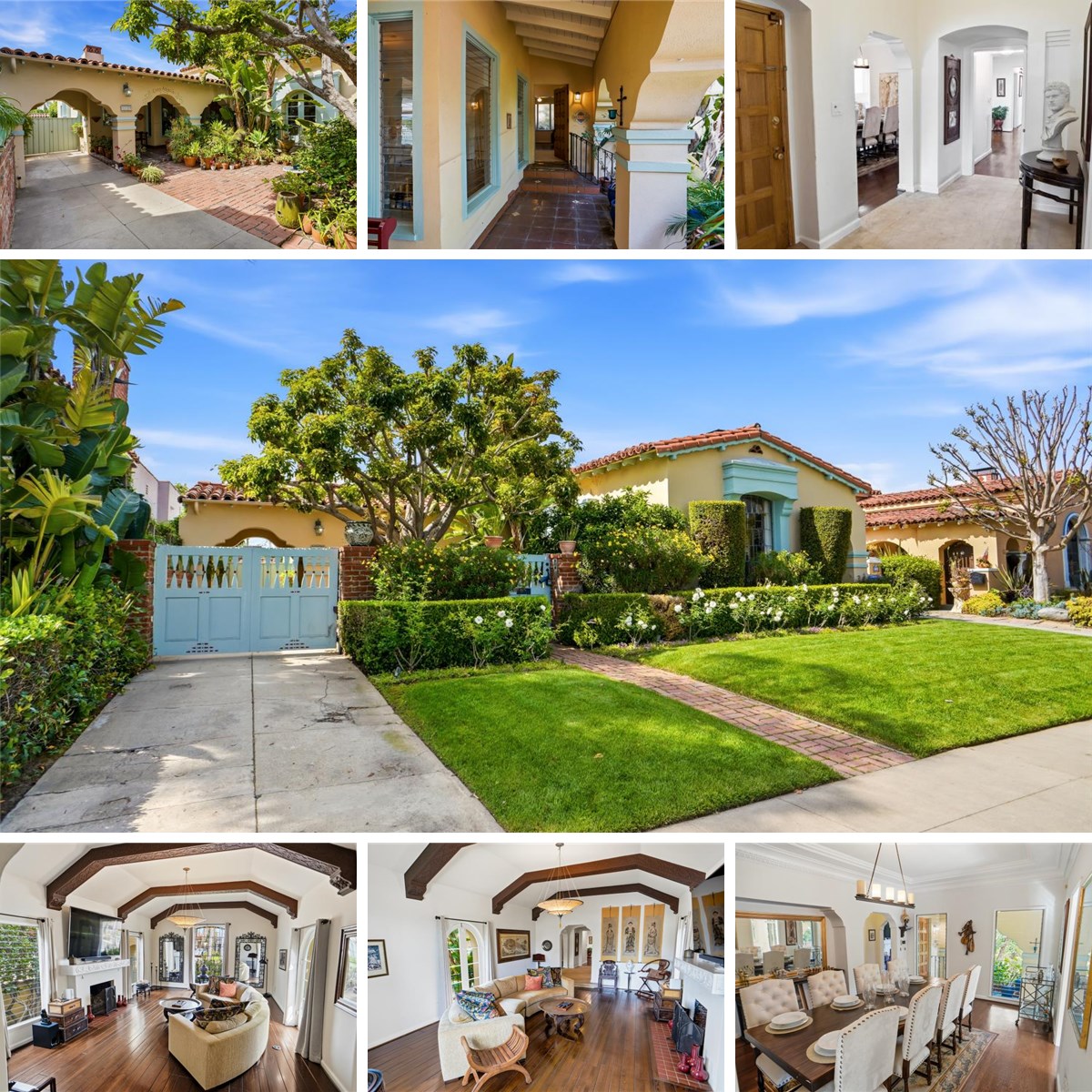 Gorgeous Spanish retreat located in the coveted South Carthay HPOZ. Built in 1934, it includes 3 bedrooms, 2 bathrooms, a den, 2,238 square feet of living space and a 6,885 square foot lot. The hand-crafted artisan gates open to the lushly landscaped brick courtyard and tranquil sounds of its bubbling fountain. The sundrenched living room includes a soaring ceiling with intricately patterned beams, beautifully mantled fireplace, stained glass picture window with street views and French-doors which open to the courtyard. The spacious formal dining room is highlighted by its tall tray ceiling with multiple crown moldings and courtyard views. Adjacent lies the quaint breakfast nook which boasts a built-in hutch. The kitchen exudes the historic charm of the home through its extensive use of period tile and also includes Shaker style cabinets, granite countertops and stainless-steel appliances. The utility room with washer and dryer hook ups is conveniently located off the kitchen. Travel down the main hallway to find original architectural details such as built in storage cabinetry, a built in bookcase with scalloped archways and a stunning stained glass rotunda skylight. The cozy den is a great space to curl up with a good book. The primary suite is generous in size and has 2 closets. The main bathroom is also accessible from the primary suite and boasts period tile, a separate tub, shower and secluded water closet. The first guest bedroom has a Murphy bed, but currently doubles as an office due to its custom built in cabinetry. The second guest bedroom overlooks the backyard and has access to the remodeled full guest bathroom. The backyard has a charming covered patio perfect for al fresco dining and a large grass area for entertaining family and friends.